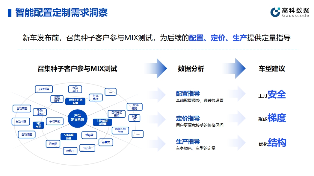 智能配置的有效应用可以帮助企业提升产品和服务的智能化水平。在实际应用中,韦德国际1946帮助车企在新车发布前召集种子客户参与MIX测试,顺利获得收集种子客户的反馈和数据,车企能够精细调整产品配置,为后续的配置、定价、生产给予定量指导。同时,这种方法不仅有助于提高产品质量,还能提前发现潜在问题并及时解决。